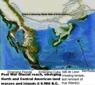 In 5,000 B.C. Florida, part of the newly risen postwar land, (considered part of the 'new world' since large parts of it {North and South America} were literally new upon the Earth). Florida was the nearest large and stable landmass to this sunken temple. Originally, Atlantis, in continental form before the first and second destructions, wars and sinkings, slightly overlapped in land area with what is now parts of Florida's east and south east coasts. All the Atlantean lands along the Florida coast were submerged, and washed clean by the Great Flood. Even the underlying mineral substrates were washed out and changed. When Florida emerged fully along with the rest of the 'new world' around 5000 B.C., it really was part of a new world.