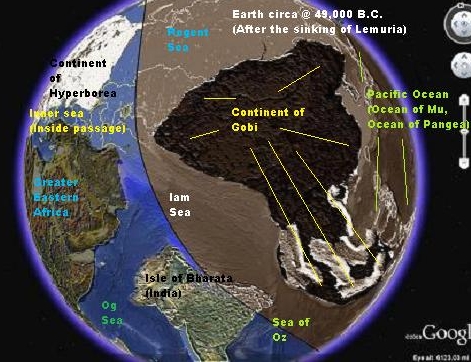 was the original land of the 4th appearing, Adam and Eve. Gobi, an original continent, was washed over and altered during the 1st Lemurian/Atlantean Cataclysm of 52,010 B.C. (see next page); bombed, rayed, destroyed and finally flooded by the Great Global Flood of 28,500 B.C. (see page 7); and also bombed, flooded and had major land mass alterations (during the Mahabharata/Atlantean World War of 10,000 B.C.) that changed Gobi into today's Mongolia, China, and a few other lands (of that area) of present day Earth (see Pages 10 and 11). More descriptions ! The 4th appearing Adam and Eve were Yellow in color, and like the rest had Divine Origins.