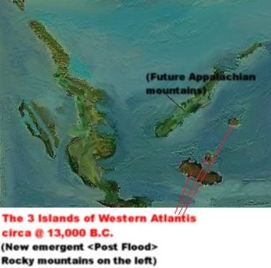 Before the sinking of Lemuria, to the west of the original Atlantean continent and stretching all the way to the East coast of Lemuria, there was nothing but mostly shallow ocean. After the sinking of Lemuria, the shoals of a new island chain rose, with the location being where the Appalachian mountains are in the U.S. today. Shoals also rose where Texas is, along with the four corners region. A great long, narrow mountainous island rose where the California and Oregon coastal ranges exist today. Shoals also were visable in parts of Canada, Alaska and central America. After the Great Flood, these shoals of Appalachia rose and became a narrow, craggy high elevation island mountain chain. Shoals also emerged in the location of today's Rocky mountain chain.